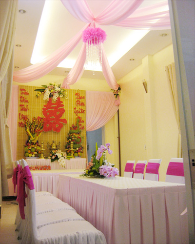 Trong đám cưới người Việt, phần quan trọng nhất chính là nghi lễ ăn hỏi, đón dâu và lễ gia tiên tại nhà cô dâu chú rể. Vì vậy không gian ngôi nhà đều được trang hoàng lộng lẫy hơn mọi ngày để đón tiếp khách chu đáo, đẹp mặt gia đình, họ hàng.